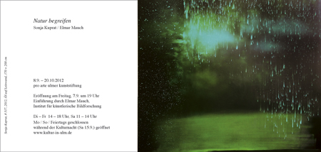 | Elmar Mauch - Denken in Bildern 15.10. - 27.11.2010 Projektraum Fotografie Huckarder Str. 8 - 12 44147 Dortmund Meine Bildforschungsarbeiten werden zusammen mit den Bilderheften vom 15. Oktober bis 28. November im Projektraum Fotografie in Dortmund gezeigt. Erstmals zeige ich dann auch verschiedene Animationen, die das Moment zwischen Still- und Bewegtbild, zwischen Dauer und Vergänglichkeit thematisieren. Im turnusmässig im Projektraum Fotografie stattfindenden Fotografengespräch Ausstellung 15.10. - 27.11.2010 Geöffnet Sa 15 - 19 h Vortrag mit Diskussion 11.11. Um 19 h Finissage 28.11. Ab 15 h Einladungskarte [PDF ] projektraum-fotografie.de |